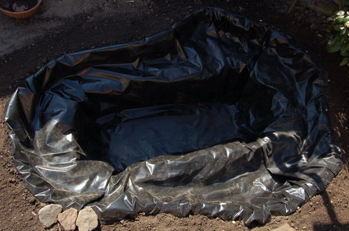Ezután megtöltötte vízzel. Már csak kövekkel és növényekkel kellett díszíteni és el is készült a kerti tavacska.