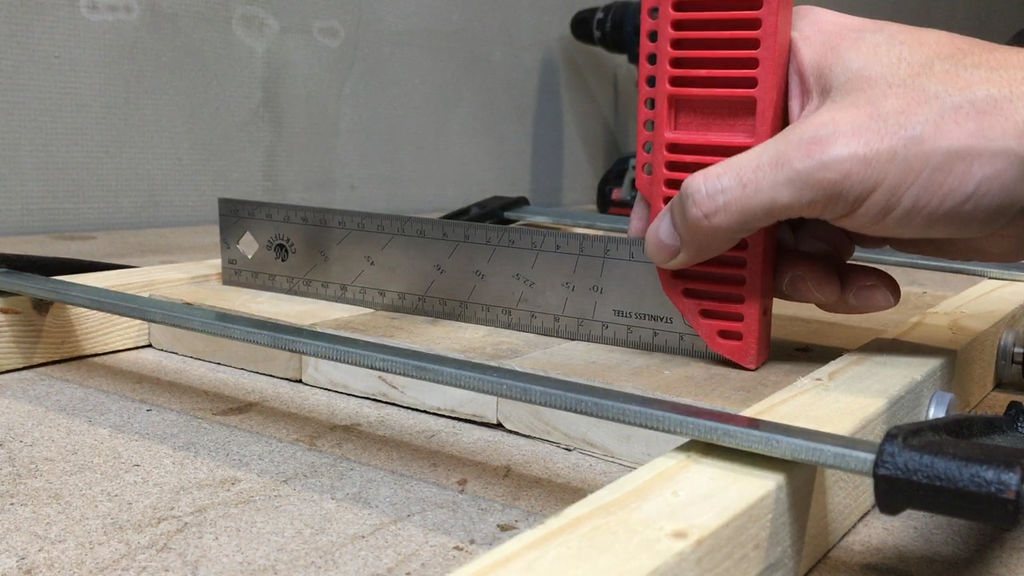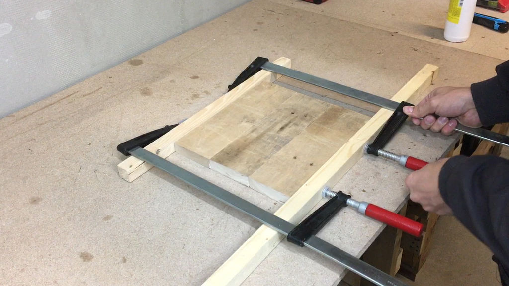 Ha minden oldalt összeillesztettél, fogj két kisebb lécet, és egy-egy kézi szorítót, és fogd össze a deszkákat. Fontos, hogy legyenek annyira vízszintben egymással, amennyire csak lehetséges. Várd meg, hogy a ragasztó megszáradjon, addig legyenek összeszorítva, azután majd jöhet a következő lépés.