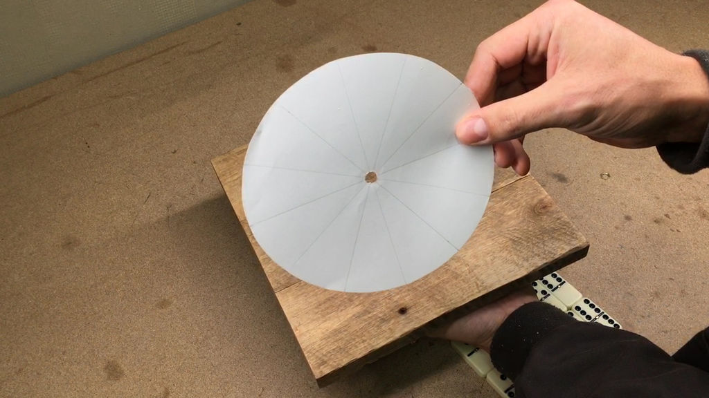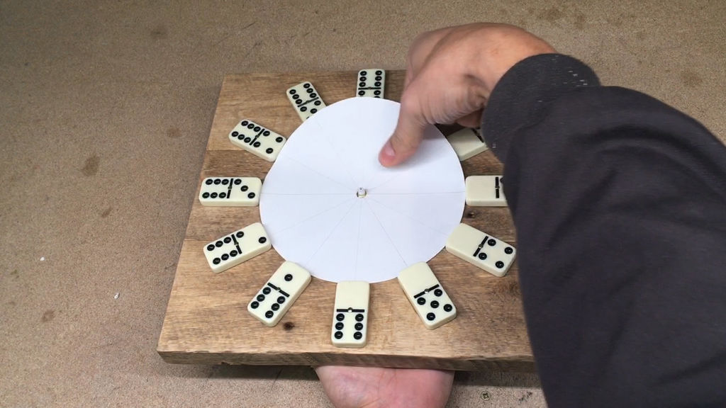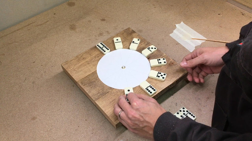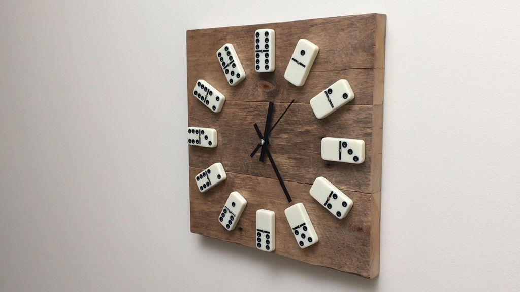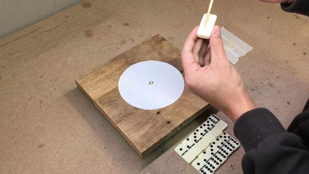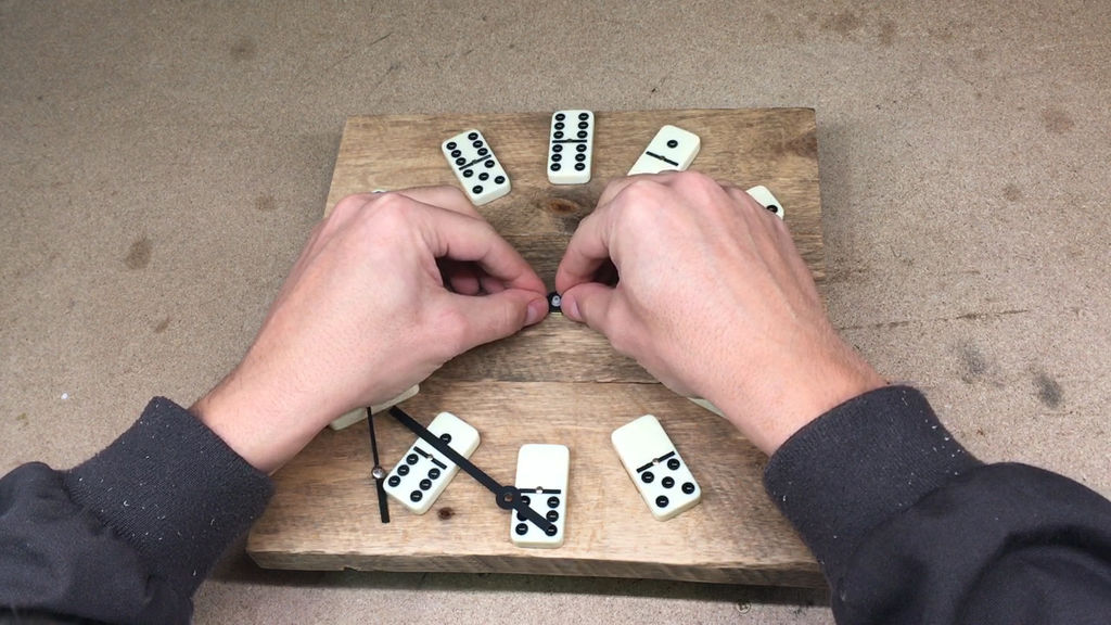 Szükséged lesz egy sablonra, ami segít pontosan elhelyezni a dominókat. Ez egy egyszerű, de szabályos, papírból kivágott kör is lehet. Dugd át az óra mechanizmusát a hátsó oldalról, és rögzítsd a helyére. Helyezd rá a sablont, majd kezdd el felragasztani a dominókat a kétkomponensű epoxyval.