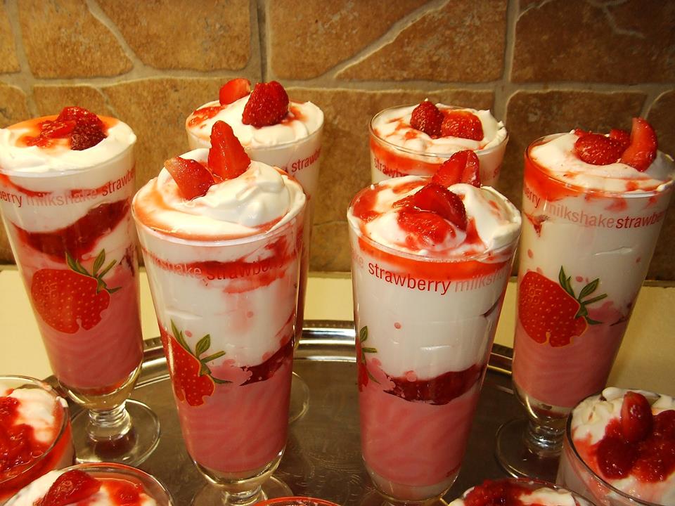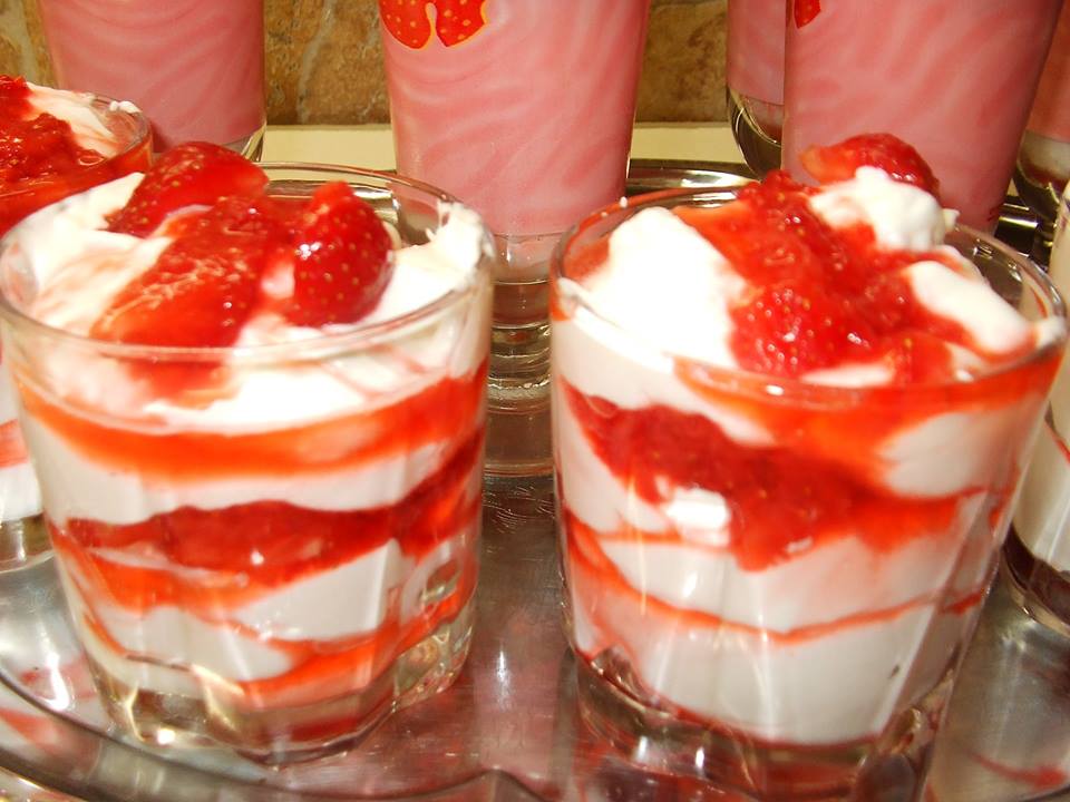 Pohárba rétegezzük az epret, krémet és az eperöntetet.
