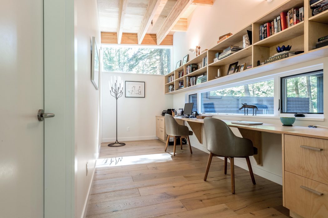 Az ügyfél rendelése egy nyugodt menedékhelyet írt le, kellő távolságra a város zajaitól. Az üvegablakokon keresztül az erdőre nyíló terjedelmes látvány békés, nyugodt hangulatot varázsol az otthonba. A fapadlók és a bútorok természetes rezgéseket kölcsönöznek az épület beltereinek.
