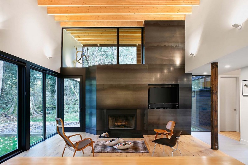 Az acél kandalló választja el továbbá egymástól a nappalit és a fedett kinti teraszt. Az egész ház egy kavicsos udvar köré épült, a vad szarvasok elleni védelmet szolgálja.