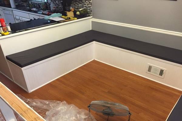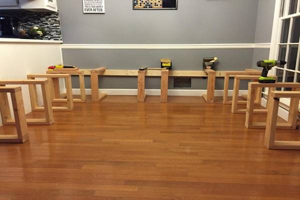 Miután a párna a helyére került, a pad lábait is álcázni kellett, hogy minden tökéletes legyen. Így az ülősarok már tökéletesen illeszkedik az étkezőbe.
