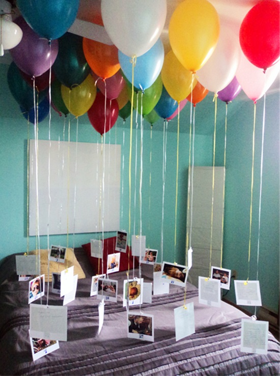 Ez a megoldás leginkább születésnapokra, évfordulókra jó választás. Csak fel kell fújnod néhány lufit, és a lufikhoz hozzá kell kötnöd a fotókat. Az biztos, hogy egy remek meglepetés lesz!