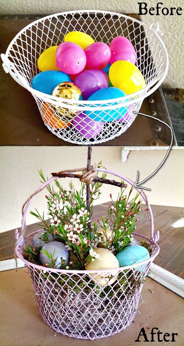 1.Néhány műanyag tojás és egy kosár kell csak a következő ötlethez, amit bárhol elhelyezhetsz a lakásban! Ha egy kicsit még különlegesebbé szeretnéd varázsolni ezt a dekorációt, akkor szerezz be hozzá egy kis mohát és néhány növényt, esetleg virágot is!