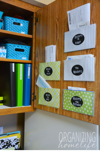 Néhány papír segítségével könnyedén készíthetsz ilyen remek tárolókat a szekrények ajtajában, ahol rendezetten elhelyezheted a papírjaidat.