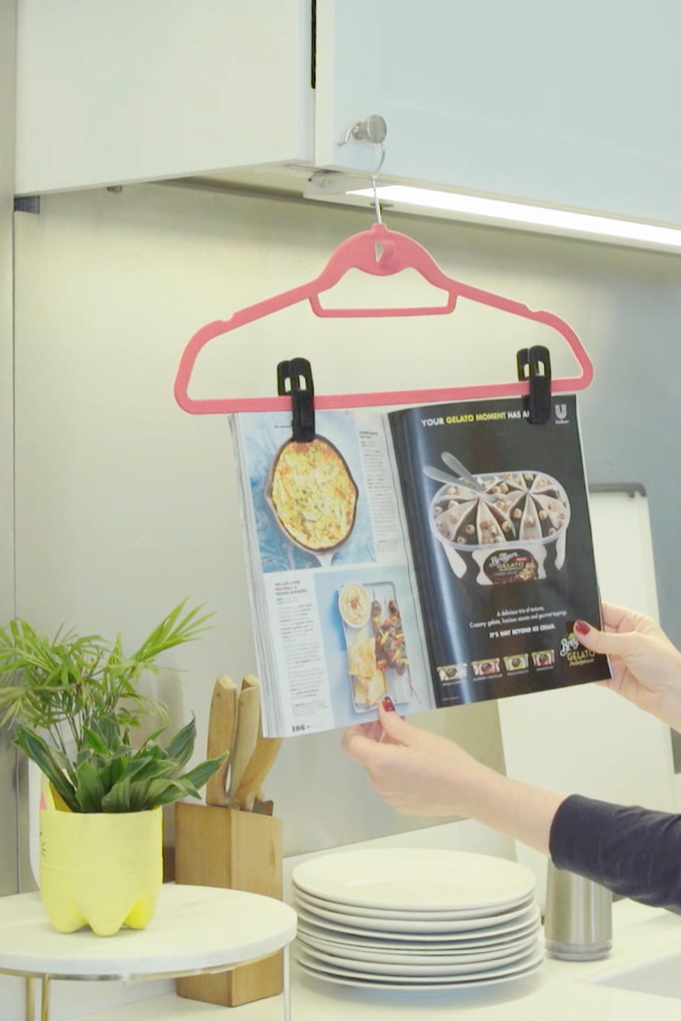 Ha nincs hely konyhapultodon, ahová letehetnéd receptkönyvedet, akkor fogj egy egyszerű vállfát csipeszekkel és akaszd fel vele receptkönyvedet a konyhaszekrény gombjára. Nem csak helyet spórolhatsz meg így, de a receptkönyv is folyamatosan szemmagasságban lesz majd.