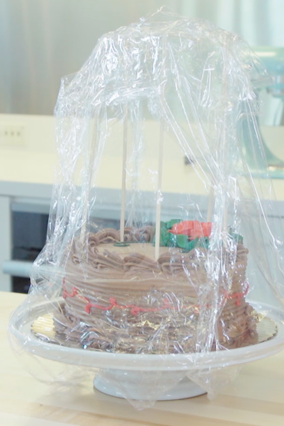 Ha a torta az utolsó pillanatban fut be, és nincs semmi, amiben elszállíthatnád a partyba úgy, hogy ne tennéd tönkre, akkor itt egy gyors és egyszerű megoldás. Helyezd a tortát egy olyan tányérra, amin kényelmesen elfér, majd szúrj bele néhány hurkapálcát és takard le az egészet folpackkal. Amikor kész vagy tálalni a tortát, csak húzd ki a hurkapálcákat, és szúrj a helyükre néhány díszt vagy gyertyákat.