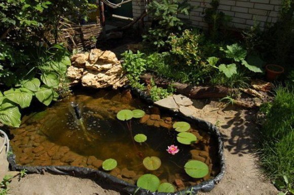 Ezután megtöltötte vízzel. Már csak kövekkel és növényekkel kellett díszíteni és el is készült a kerti tavacska.