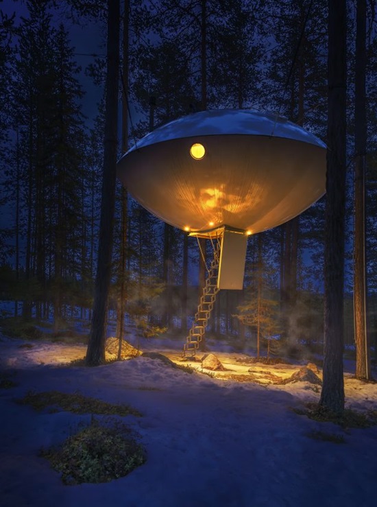 Végül térjünk vissza Svédországba, ahol láthatóan nagyon kedvelik a kreatív lombház-designokat. Mit szólnál egy idegen űrhajóhoz?
