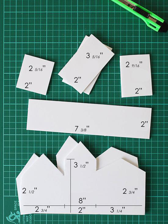 Első lépésként vágd ki keményhab lemezből az alábbi formákat, ügyelve a rajtuk jelölt méretekre. Ehhez egy sniccert használj, mert az ollók hajlamosak összenyomni a habot, amit így nehezebb lesz később megragasztani.