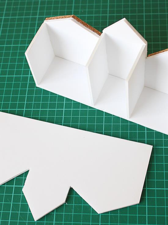 A harmadik lépés a házak „megépítése”. Először ragaszd a házak elejét (amiket az előbb feldíszítettél) a hosszú alaphoz. Ügyelj rá, hogy a házak elejét a lap oldalsó élére ragaszd, hogy ne látszódjon, ha szemből nézed. Ha megszáradt, jöhetnek a megfelelő méretű elválasztó falak a házak közé és természetesen a széleikre. Mielőtt a hátlapot is felragasztanád, hagyd, hogy minden fal a helyére száradjon.