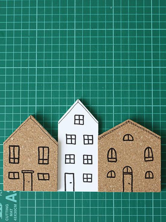 A második lépés „beburkolni” a házakat a parafával – ezt persze kihagyhatod, ha nem tetszik. Ha szeretnél némi változatosságot, akkor vágd ki a megfelelő méretű parafákat a házakra, majd a ragasztóval rögzítsd őket rájuk. Végül rajzold meg filccel az ablakokat, az ajtókat, és minden egyéb részletet, amit szeretnél.
