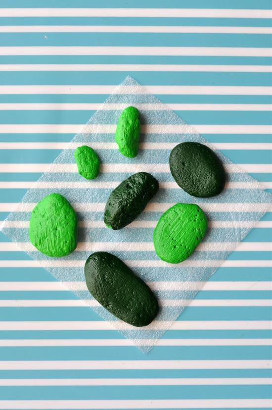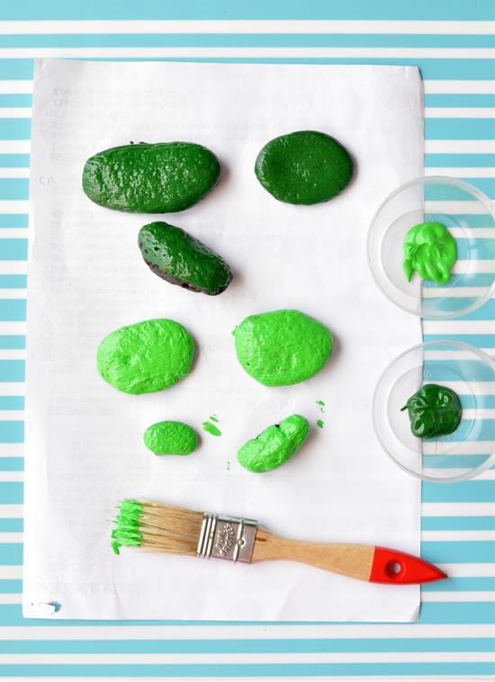 - lépés: Használd a nagy ecsetet és vidd fel a sötétzöld és világoszöld festéket a nagyobb kavicsok egyik oldalára. Ha egy kicsit vastagabb rétegben viszed fel a festéket, akkor nem lesz szükség két rétegre. Várd meg, amíg megszáradnak a kavicsok.