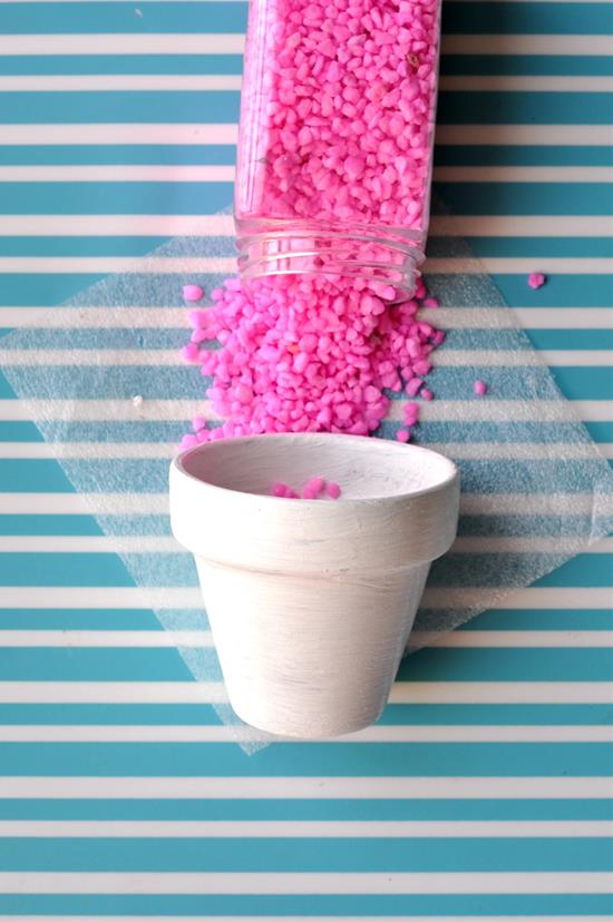- lépés: Ha már minden megszárad, akkor jöhetnek az aprócska dekorkövek, amivel töltsd fel a kaspót. Egy dologra vigyázz: mielőtt beleöntenéd az apró köveket, ellenőrizd, hogy van-e a kaspón vízelvezető lyuk, ha igen, akkor ezt be kell fedned egy kis darab papírral, különben minden kő ki fog esni belőle.