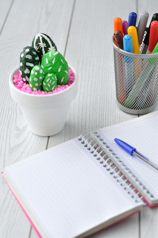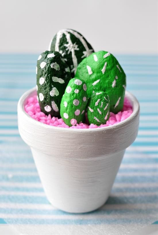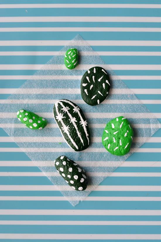 - lépés: Vedd elő a vékonyabb ecsetet és a fehér festéket. Fess apró, fehér vonalakat, pöttyöket, és egyéb jelzéseket a kövekre, így igazán egy kaktuszra fog hasonlítani a végeredmény.