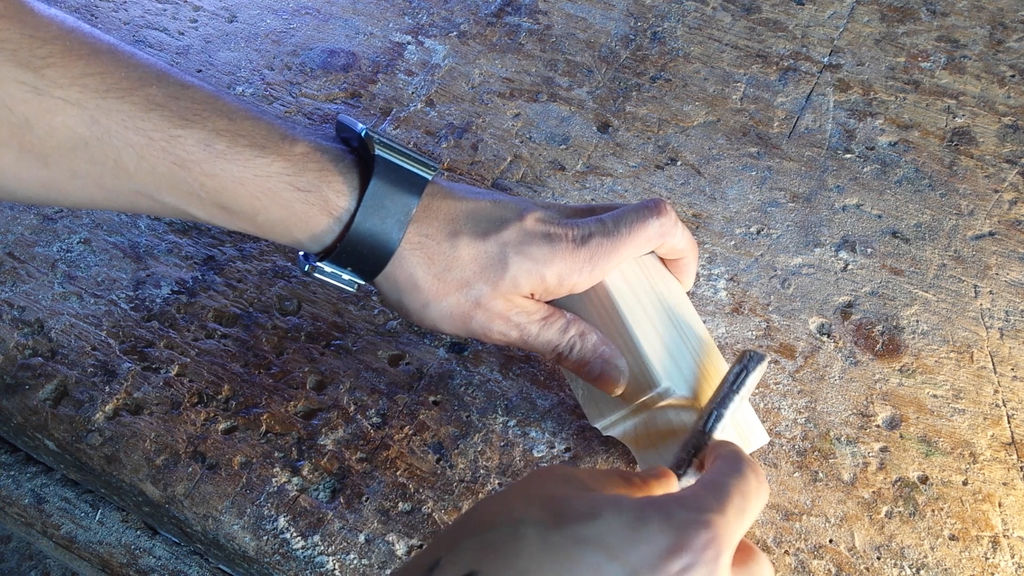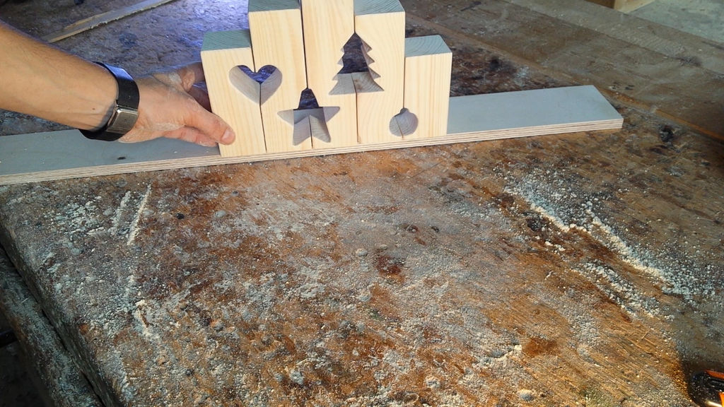 Fogj néhány kétoldalú ragasztószalagot és erősítsd fel velük a sablont a fadarabokra. Ez után nincs más dolgod, mint óvatosan kivágni azokat a vonalak mentén. A legegyszerűbb ezt egy olyan fúrószerszámmal elvégezni, ami fix pozícióban áll, miközben te a fadarabot mozgatod rajta.