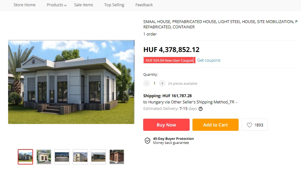 Képzeljük el, ahogy az Aliexpresst böngésszük esetleg egy új fülbevalóért, mégis egy családi házba botlunk: ez ugyanis könnyen megtörténhet! Legolcsóbban, akár már 4,37 millió forintért berendelhetünk egy előregyártott készházat országunkba, melynek a mérete 62 négyzetméter. Amennyiben meg szeretnénk rendelni, további 161 ezer forintért hazánkba is szállítják a kiválasztott otthonunkat.