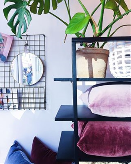 Egy agyagcserépbe ültetett pálma és néhány rózsaszínes, lilás bársonypárna kellemesen egyedi hatást kölcsönöz ennek a modern, ipari stílusú szekrénynek.