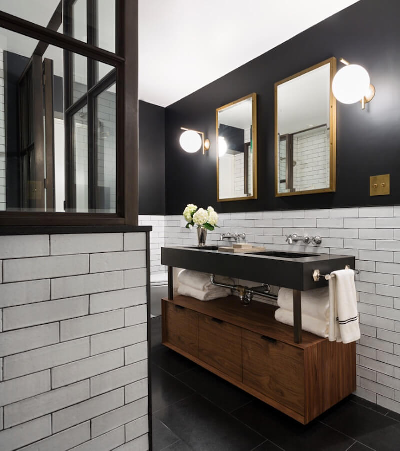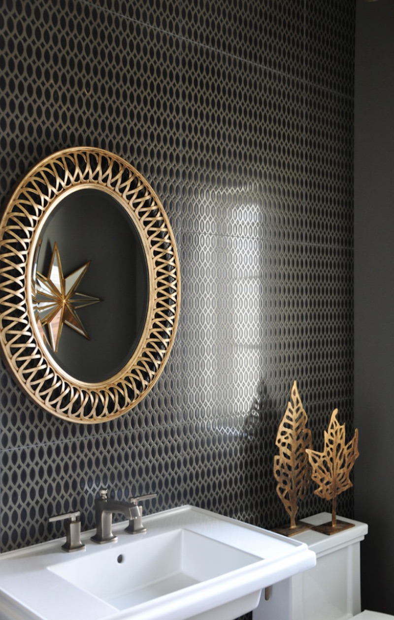 Arany és ezüst jól működik együtt, bár a legtöbben nem szeretik őket kombinálni egymással. A két legnépszerűbb fémet azonban egyáltalán nem egyszerű stílusosan kombinálni egymással. A képen látható módszer azonban tökéletesen bemutatja, hogy hogyan lehet a különböző fémes elemeket kombinálni egymással. A fekete fal, az aranyozott keretek, és a fehér csempe tökéletesen kiegészítik egymást.