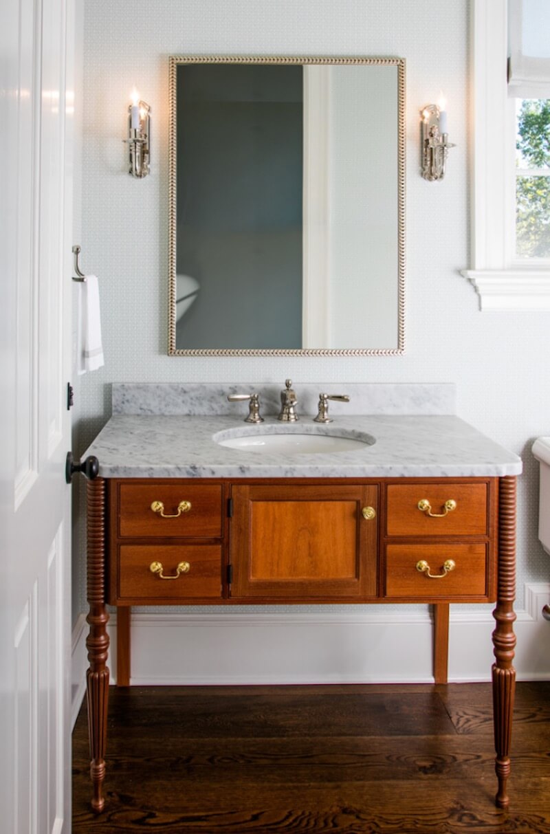 A képen látható megoldás tökéletesen bemutatja, hogy hogyan lehet igazán stílusosan kombinálni a fémes árnyalatokat finomabb színekkel. A fa szekrény tökéletesen illeszkedik a különleges tükörhöz, és remekül harmonizál a szekrény fogantyúival.