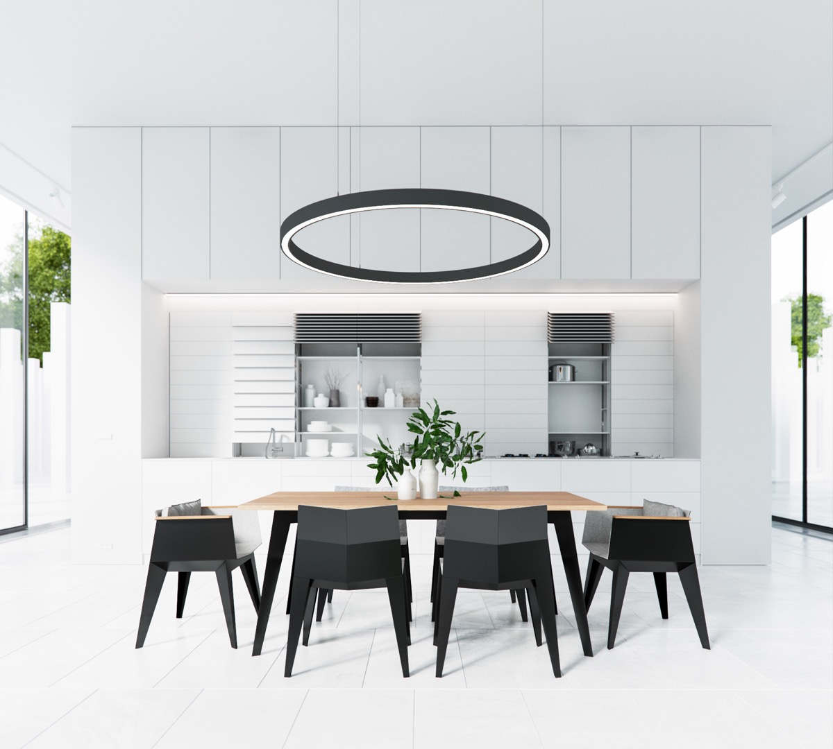 A világítást soha nem szabad elfelejteni egy étkezőben - ezek a fekete fényforrások remekül passzolnak a fekete asztalhoz, a fehér falaknak, valamint a barna székeknek köszönhetően nem lesz túl komor a végeredmény.