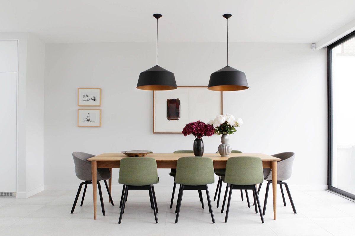 Mint a legtöbb minimalista helyiségben, itt is megjelenik a fehér szín. Ebben a skandináv stílusú étkezőben a fehér falak és a betonpadlók világos, tágas teret hoznak létre egy ipari stílusú otthonban.