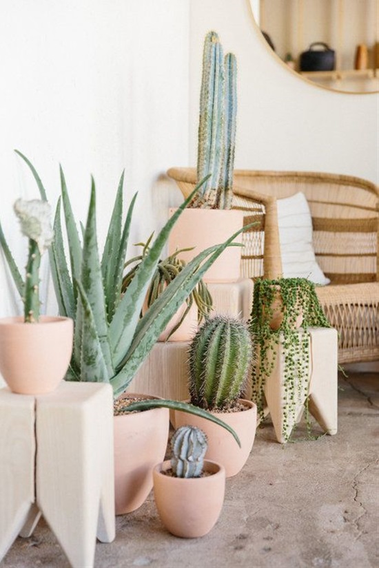 Ha különböző kaktuszokat és pozsgás növényeket egy napos sarokban csoportosítod, akkor rengeteg textúrát adhatsz az otthonodhoz. A színes kaspók különösen felkelthetik az érdeklődést.