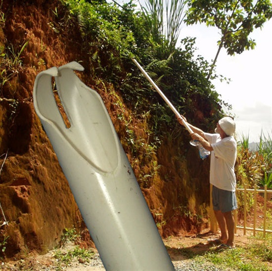 Ez a bogyószedő egy sima PVC csőből készül. A kivágott műanyag felhevítve alakíthatóvá válik – elég két „ujjat” hajtani belőle, amik leszakítják a nehezen elérhető bogyókat és terméseket a fákról és kényelmetlenebb helyekről. A leszedett termések a cső másik végén pottyannak ki, ahol egy odarögzített szatyorba könnyedén összegyűjtheted őket.