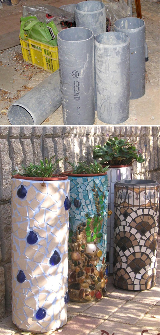 Ki mondta, hogy a PVC csövek nem lehetnek a kert legszebb díszei? Egy kis kreativitás, némi türelem, és ragasztó, és máris kész egy ilyen mozaikkal ékesített ültető.
