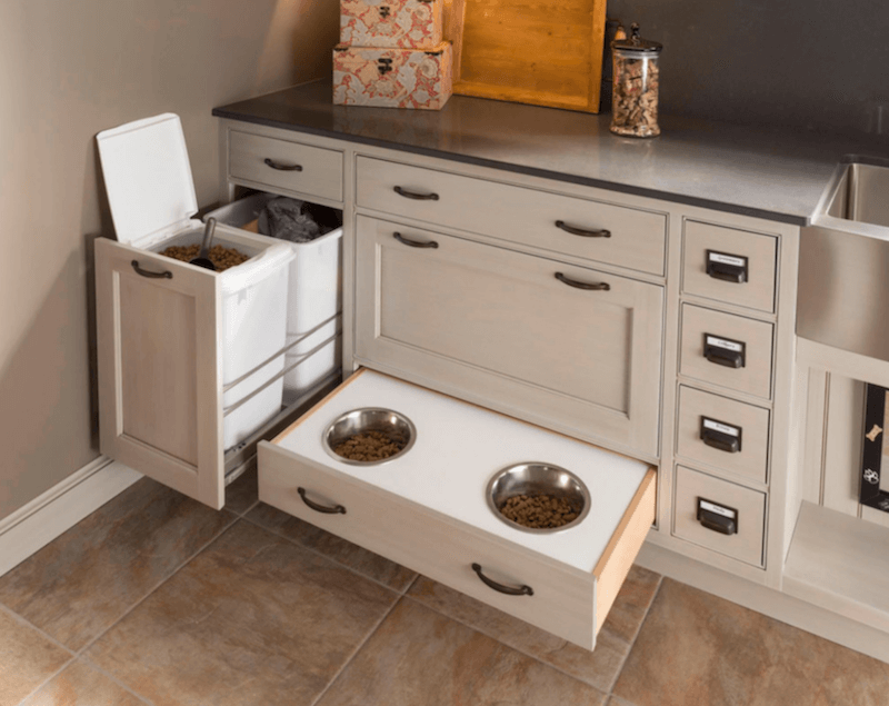 Az eledeleket nem egyszerű rendezetten és szépen tárolni, valamint a tálak a földön nem mindig szépek, ráadásul könnyedén a földön landolhat az eledel. A képen szereplő elrejthető tálak és ételtartók nagyon jó megoldások lehetnek, ha szeretnéd rendezetten tárolni ezeket.