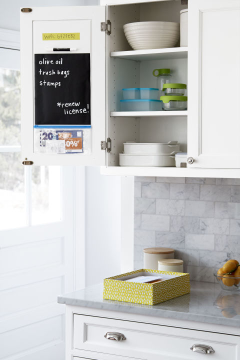 Alakíts ki egyfajta „rendközpontot” egy konyhaszekrényed ajtaján belül, ahová bekerülhet a Wi-Fi jelszó, a jegyzetek, a kuponok, stb. Vágj méretre egy lap táblafóliát, és írj fel minden fontos tudnivalót rá, hogy valahányszor kinyitod a szekrényt, mindig emlékeztethesd magad róluk.