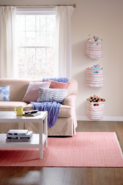 Akassz vászonkosarakat a falra (akár sorban, akár oszlopos elrendezésben, ahogy jobban elférsz). Ezekbe aztán mindenféle játék, újság vagy bármilyen apró holmi bekerülhet.