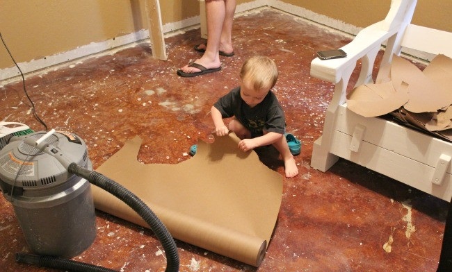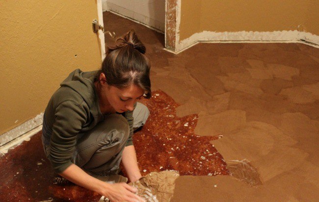 Az előkészített papírt mártsuk kevés ragasztóba és kezdjük el a padlóra ragasztani. Figyeljünk, hogy ne maradjanak rések a papírok között, mert akkor a padló nem lesz egyenletes. Mindenhol takarja el a papír az aljzatot.