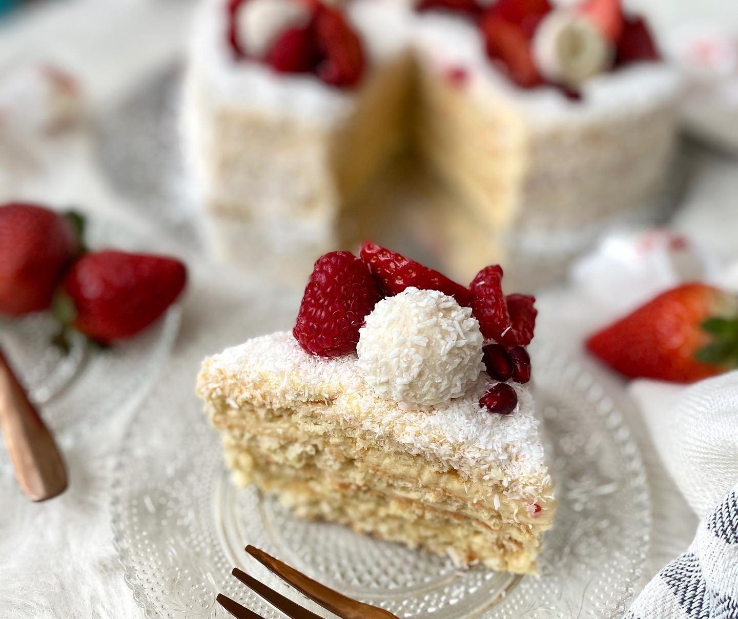 Mandulás-kókuszos lapok között vaníliás fehércsokis krém, kívülről kókuszbundával és egy kis raffaellos gyümölcsdekorral, mindezt szív alakban: kell ennél több a szerelmesek napjára? Nem kell hozzá nagy előkészület sem, így szinte bárki meg tudja csinálni!
