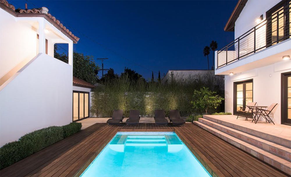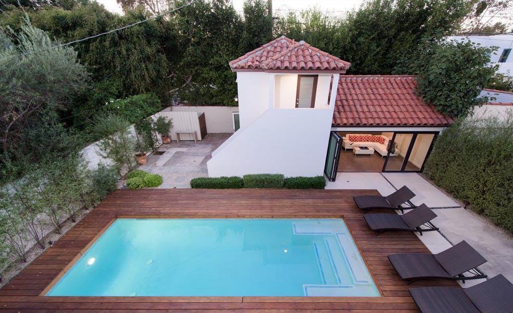A medence a főépület (jobb) és az attól különálló, de egymáshoz csatlakoztatott vendégbungaló és cabana vendégház (bal) között helyezkedik el.