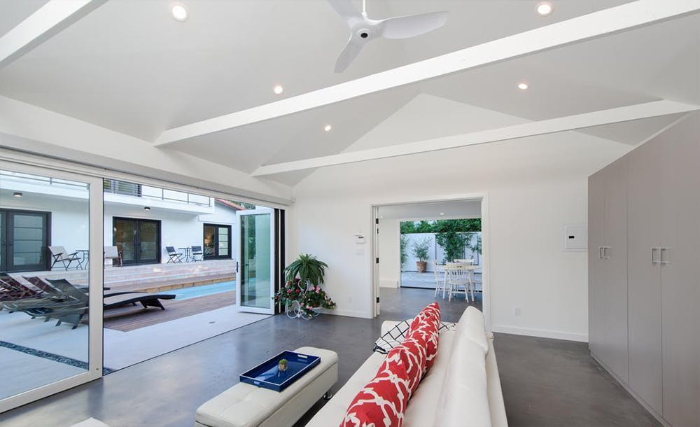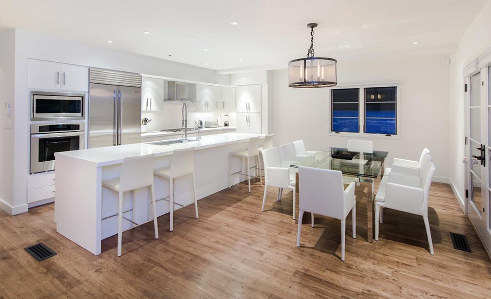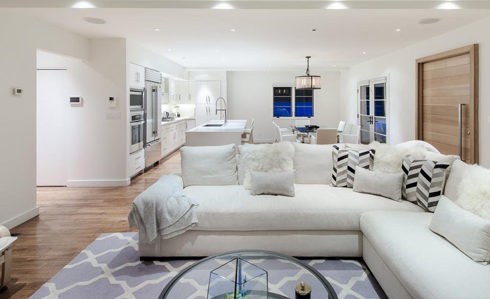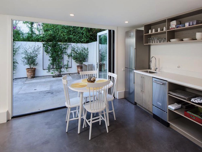 A nyitott tervezésű kialakításnak köszönhetően a konyha, a nappali, és a ház hátsó része egy térben helyezkednek el. Az életteret fehér bútorok teszik modernné és letisztulttá.