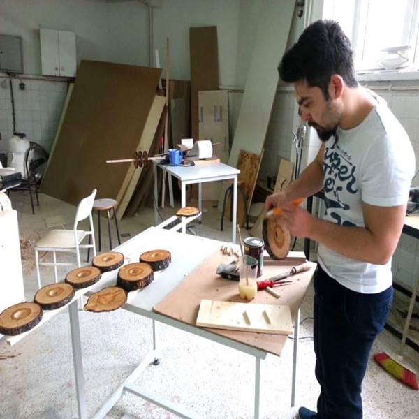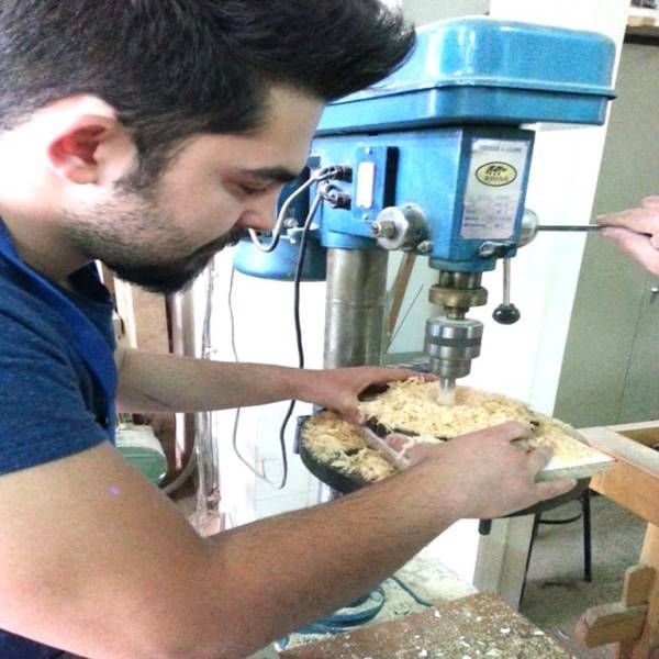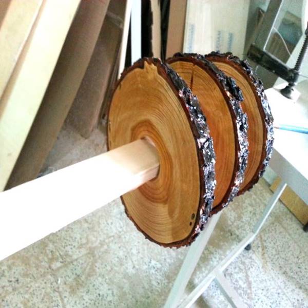 Az ügyes kezű mesterember először is korongokat vágott a fából, amelyek közepébe lyukat fúrt, majd faápoló festékkel lekente, ami kiadta a fa természetes színét, majd a korongok közé becsúsztatott egy hosszú lámpacsövet, és el is készült a mestermű.