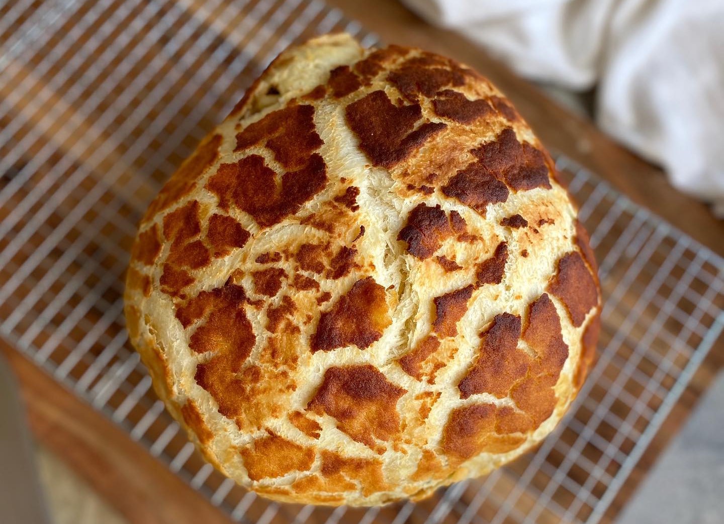 Sült hagymával; kívül ropog, belül puha, magában is simán csúszik. Hűtőben kelesztve gyerekjáték, és nem kell őrizni nehogy túlkeljen. Készüljetek be hozzá este, reggelire akár frissen el is készülhet, a család nagy örömére.