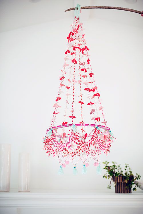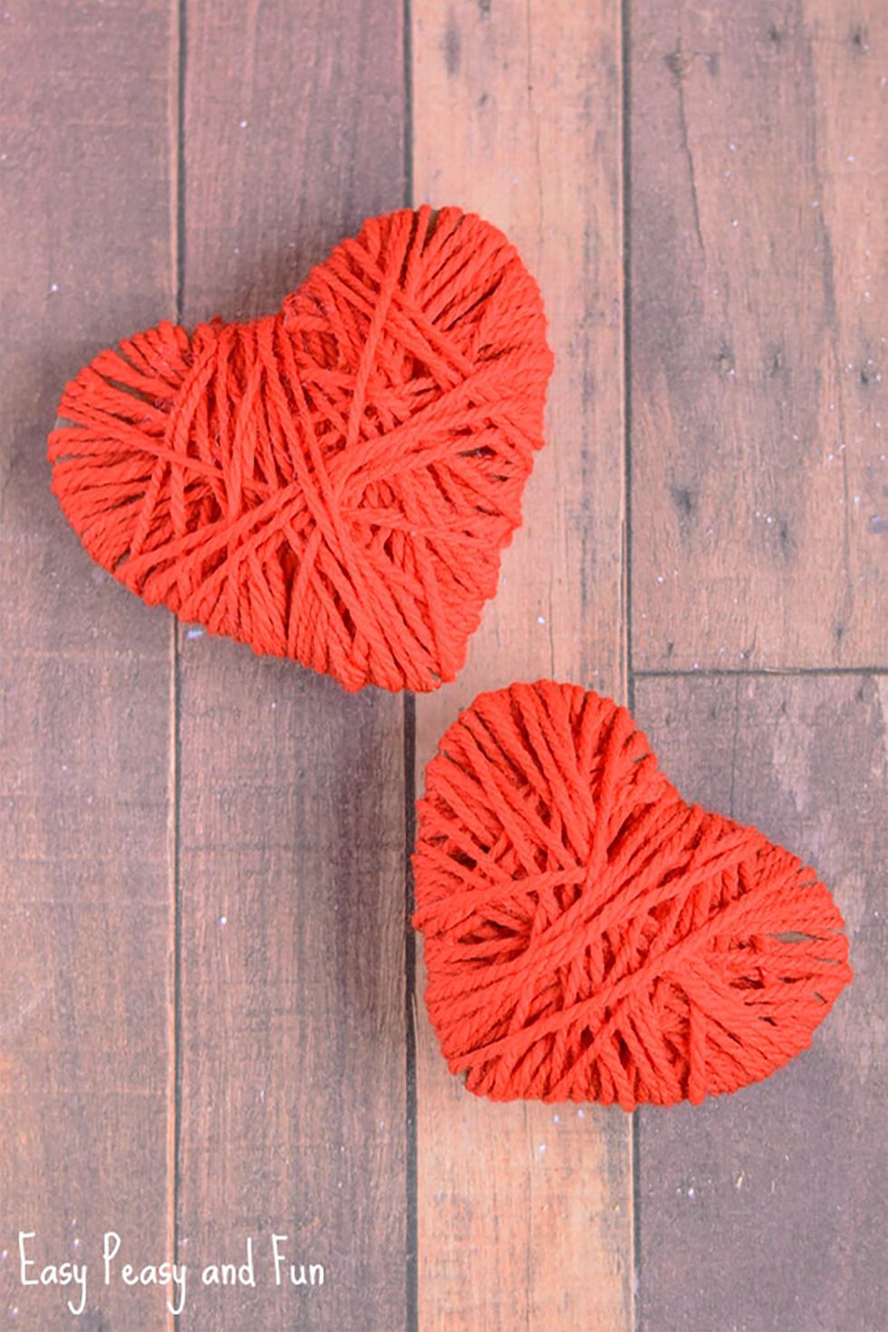 Egy szív alakúra vágott kartonpapír, egy kis ragasztó, és egy csomó piros fonál – másra nem is lesz szükség ehhez az egyszerű, de kedves díszhez.