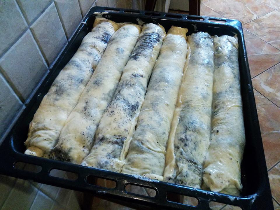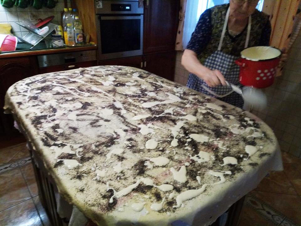 Amennyire csak lehet kinyújtotta vékonyra egy abroszon (szinte mint a hártya) majd meghintette cukros mákkal, olvasztott zsírral jól meglocsolta és végül mehet rá a tejföl (jó 1,5 liter tejföl rá ment erre abban felhabolt tojás és cukor izlés szerint).
