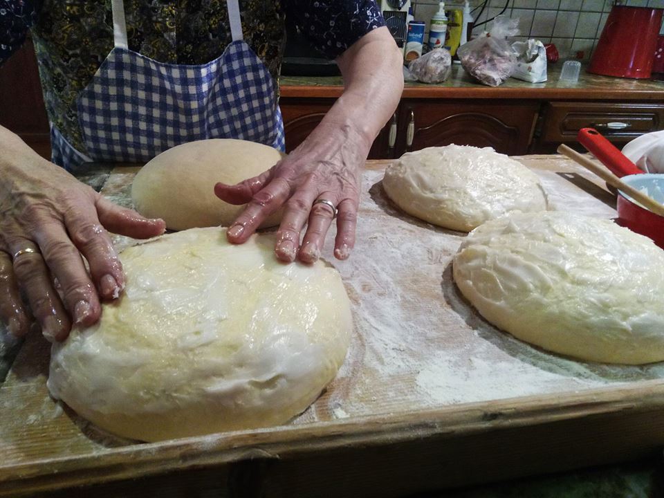 1,5 kg liszt, nagy tepsibe elég (a képen látható méretű, kb 12 szál). Ebbe rakott 4 egész tojást, 2 jó kanál rideg zsírt, 7,5 dkg élesztőt felfuttatott kevés langyos vízben 1 kanál cukorral. Majd rétes állagúra gyúrta sós langyos vízzel (csak annyi sót, hogy kellemes legyen a tészta, ne legyen sótlan se sós)